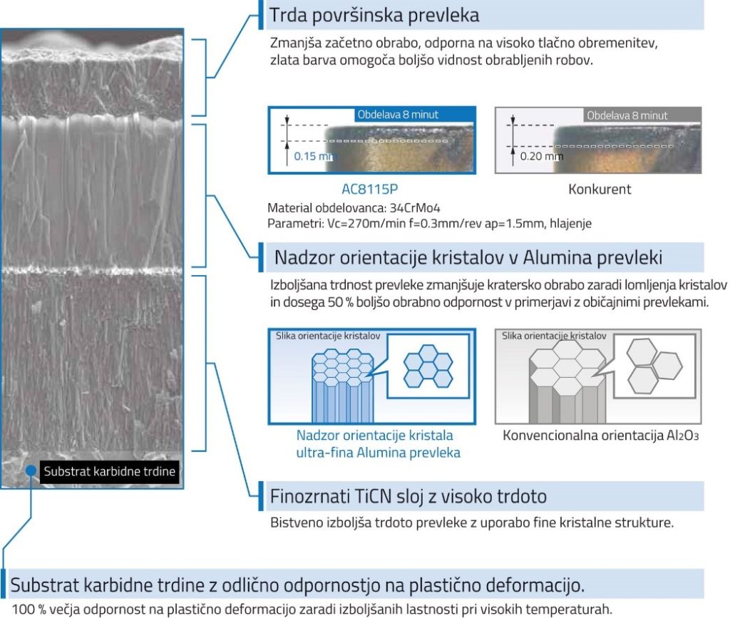 Visoko-hitrostno struženje jekla postavlja visoke zahteve po odpornosti rezilnega orodja stabilni obdelavi. Nova kvaliteta AC8115P, ki jo je razvilo podjetje Sumitomo Electric, predstavlja nov mejnik na področju visoko-hitrostne suhe in mokre obdelave. S kombinacijo napredne tehnologije prevlek in izboljšanega substrata ta kvaliteta bistveno poveča učinkovitost obdelave, hkrati pa izpolnjuje zahteve po trajnostni proizvodnji. V nadaljevanju so podrobneje opisane značilnosti, in sestava AC8115P ter njene prednosti pri uporabi.