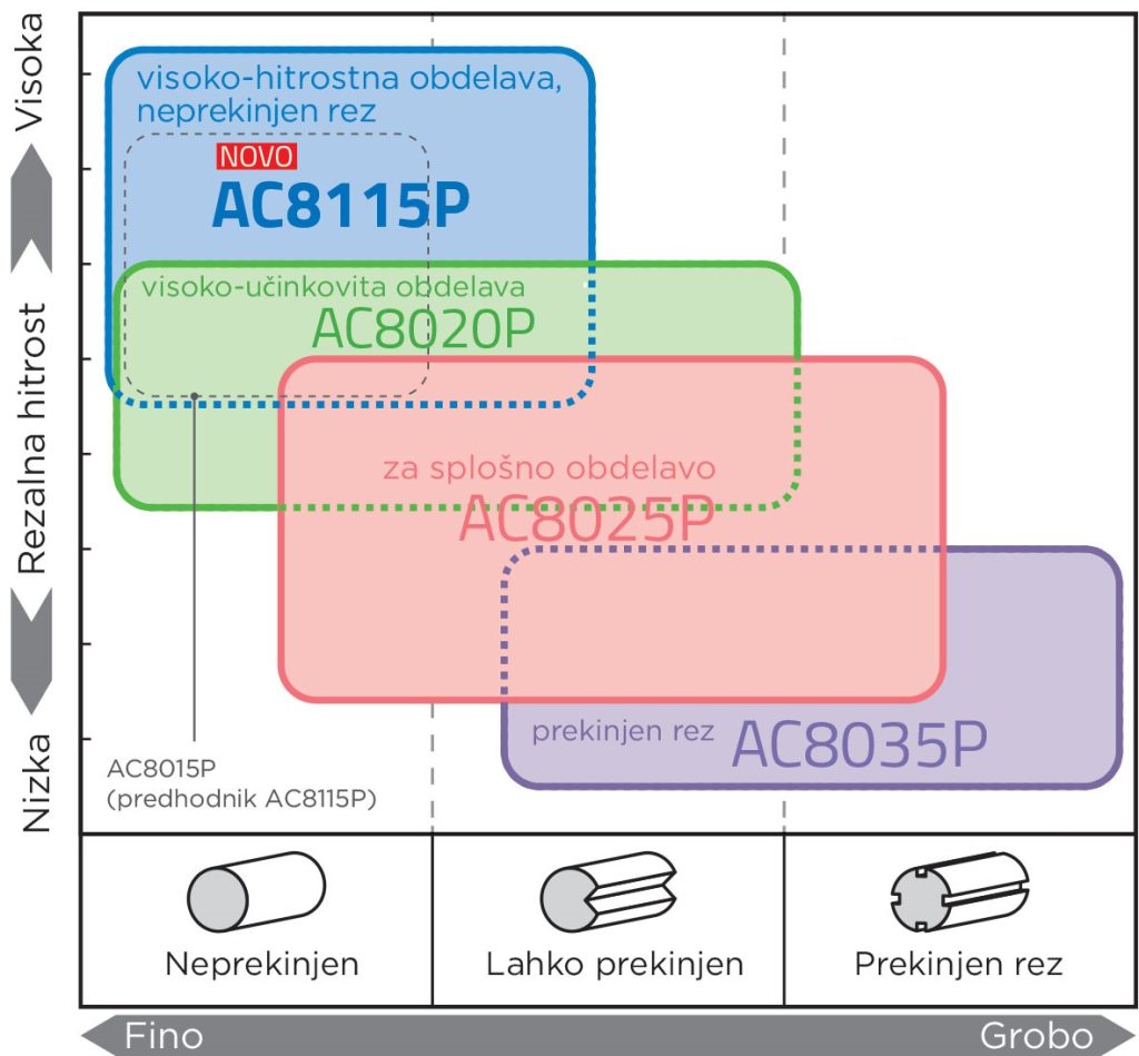 Sumitomo je nedavno razvil novo kvaliteto AC8115P, ki je namenjena za visoko učinkovito suho in mokro struženje jekla. Pokriva ISO razrede materialov P05, P10 in P15. Namenjena je za visoko-hitrostno fino obdelavo z neprekinjenim rezom. Ta kvaliteta omogoča daljšo življenjsko dobo orodja , zmanjšuje stroške obdelave, hkrati pa izpolnjuje okoljske cilje z nižjo porabo energije in možnostjo obdelave na suho.