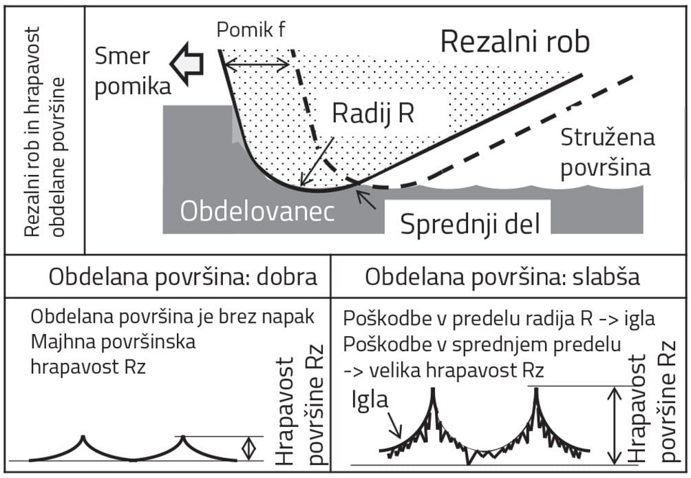 Slika 2 prikazuje odvisnost med poškodbami orodja in kakovostjo obdelane površine. Poškodbe orodja, ki še posebej vplivajo na kakovost obdelane površine, so poškodbe na mestu, kjer je orodje v stiku z obdelovancem (radij R in sprednji predel na sliki 2). Krušenje ali tvorba nalepka na radiju R in v sprednjem predelu, v splošnem negativno vplivata na kakovost obdelane površine.