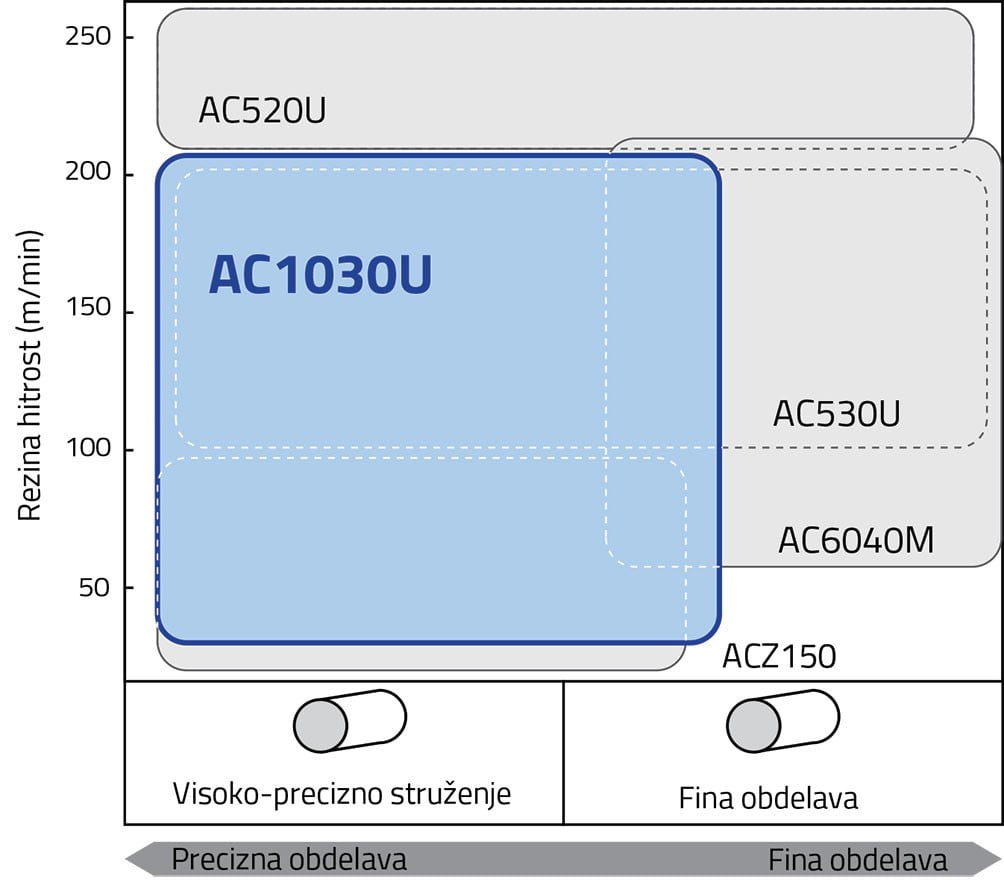 Kvaliteta AC1030U z novo PVD-prevleko Absotech Bronze ponuja odlično kakovost struženih površin in protiobrabno obstojnost pri natančnih obdelavah. V kombinaciji z novim lomilcem odrezkov FYS za fine obdelave zagotavlja odlično zmogljivost pri natančni obdelavi najrazličnejših materialov, kot so navadna, nerjavna in toplotno obstojna jekla ter čisto železo. AC1030U poleg tega znatno zmanjšuje stroške in izboljšuje produktivnost pri natančnih obdelavah.