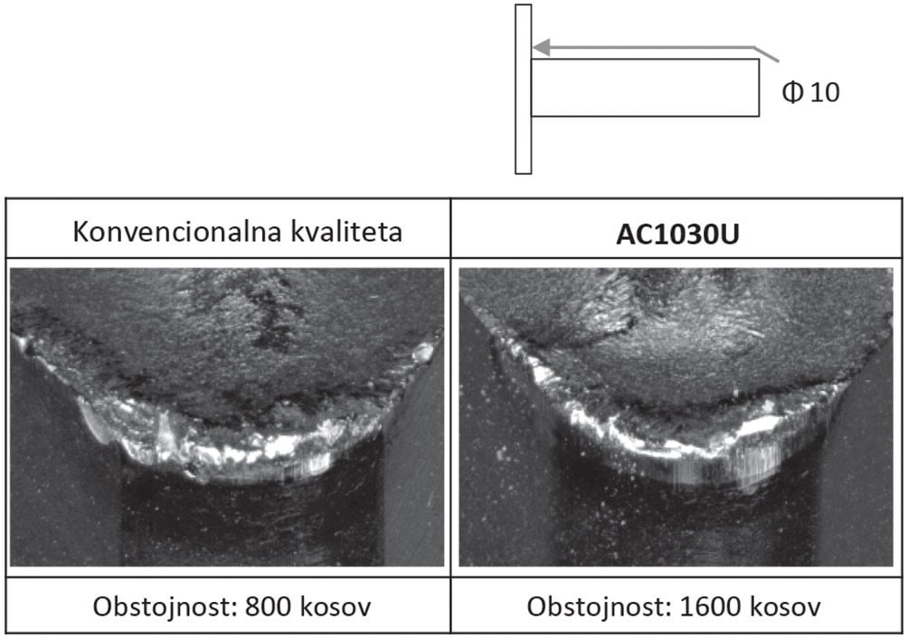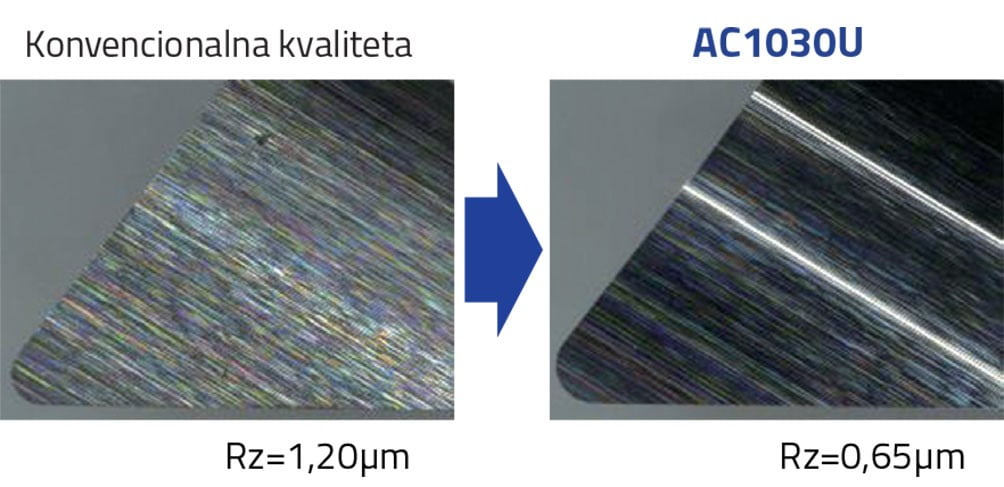 dosega boljšo kakovost obdelanih površin kot konvencionalne in konkurenčne kvalitete. Kvaliteta AC1030U prinaša bolj gladke površine tudi pri obdelavi toplotno obstojnih jekel. Izboljšanje kakovosti rezalnega robu z novo prevleko PVD in tehnologijo poliranja je doseglo želeni učinek, AC1030U pa se tako ponaša s protiobrabno obstojnostjo in kakovostjo obdelanih površin, ki sta enakovredni ali boljši kot pri konvencionalnih in konkurenčnih kvalitetah.