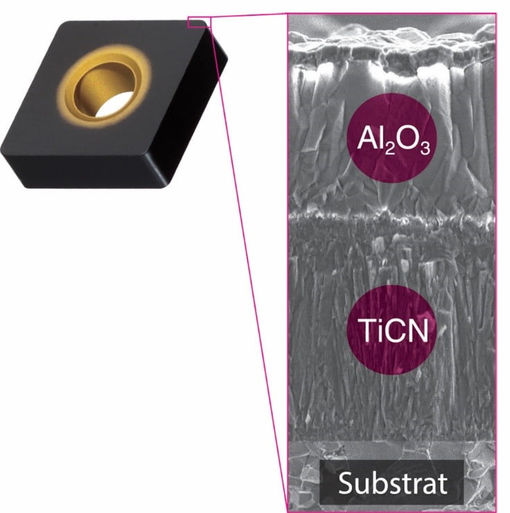 Izboljšan adhezijski spoj med substratom in prevleko, tehnologija za nadzor nad usmeritvijo kristalov Al2O3 in izravnava notranjih napetosti v slojih prevleke omogočajo podvojeno obrabno odpornost in stabilno obdelavo sive in nodularne litine.